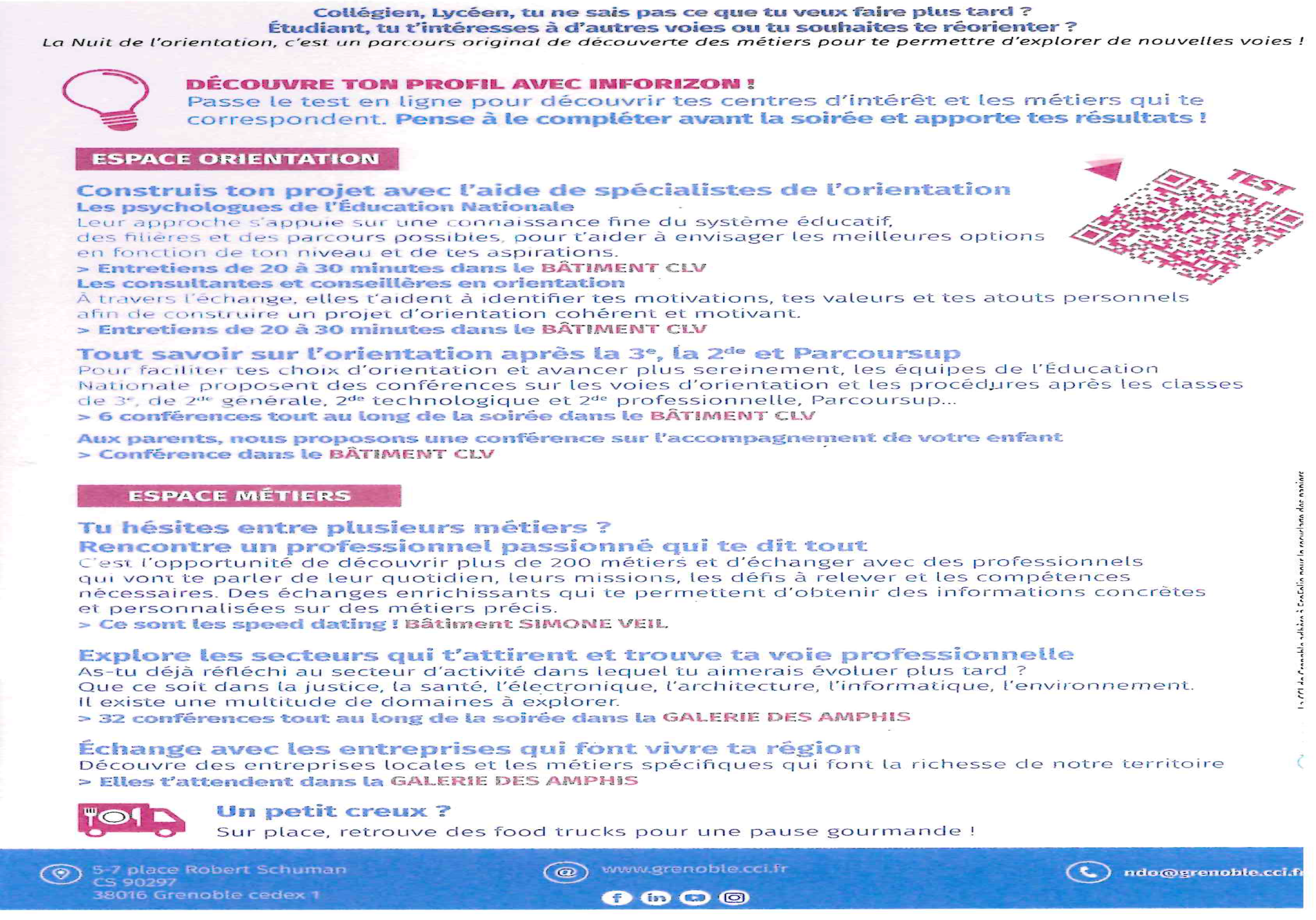 La CCI de Grenoble, en partenariat avec la DSDEN de l'Isère, organise la 6ème "Nuit de l'Orientation", le vendredi 21 novembre 2025 de 17h00 à 22h00, au Campus Universitaire de St Martin d'Hères.